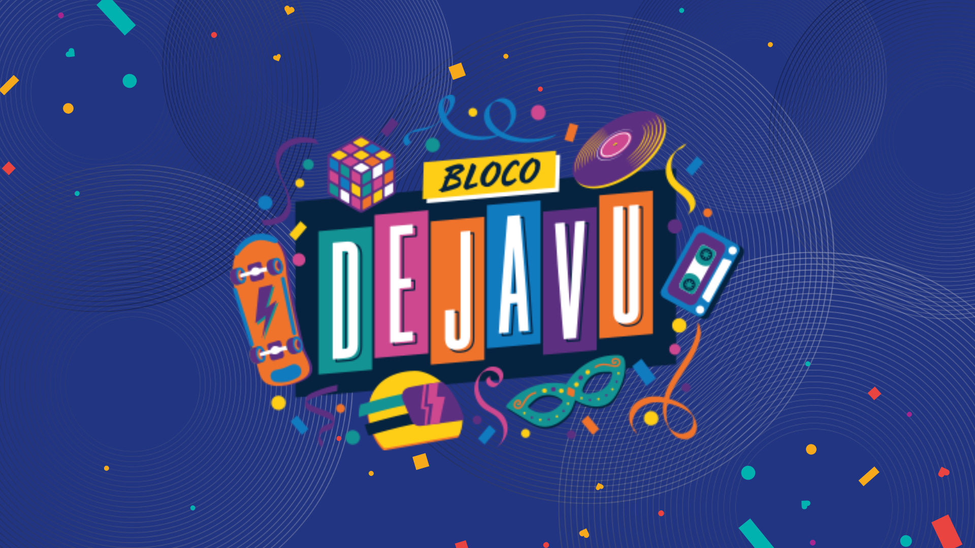 Desenvolvemos uma identidade visual vibrante e pop. Em vez dos tradicionais pandeiros e passistas, a direção de arte focou-se em ícones de uma geração: cubos mágicos, cassetes, skates e vinis, misturados com elementos carnavalescos subtis.