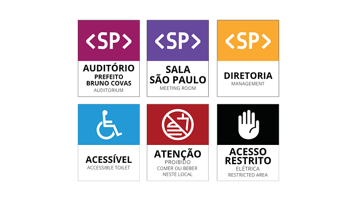 Iconografia Inteligente: Desenho de todo o sistema de orientação do edifício (placas suspensas, identificação de portas, acessibilidade). A marca foi resumida à tag