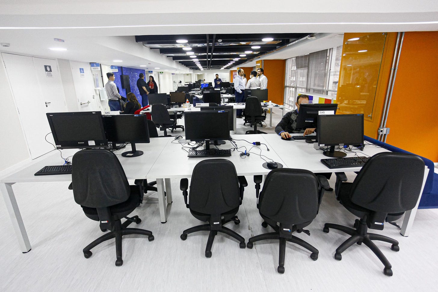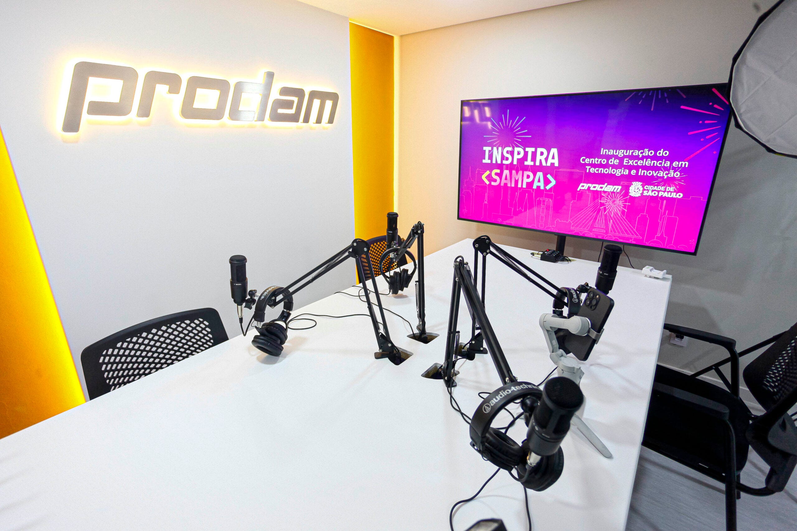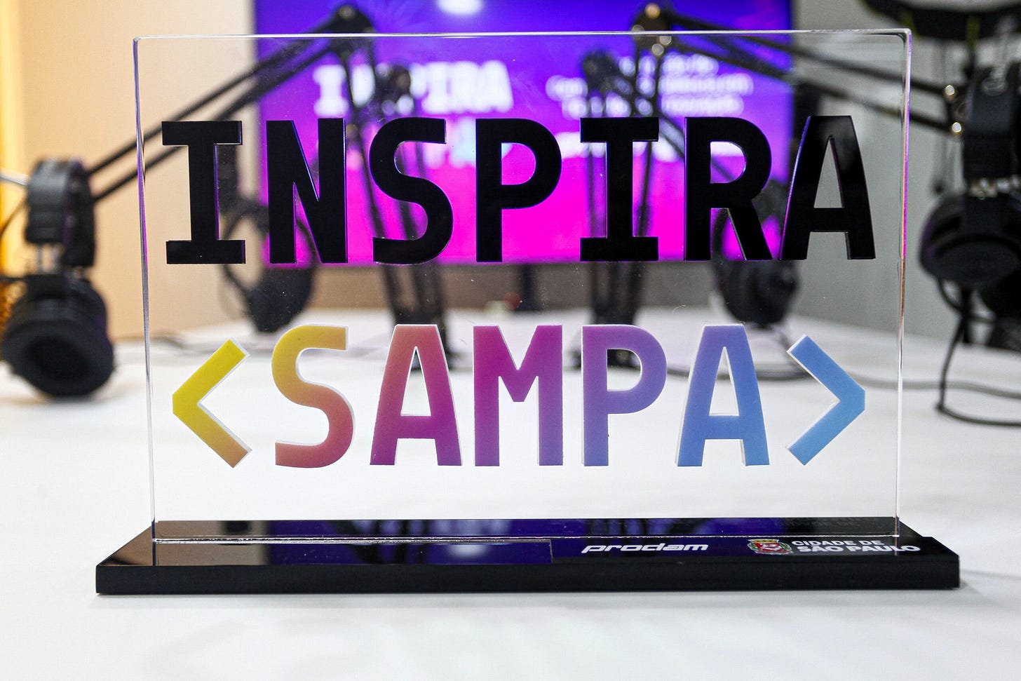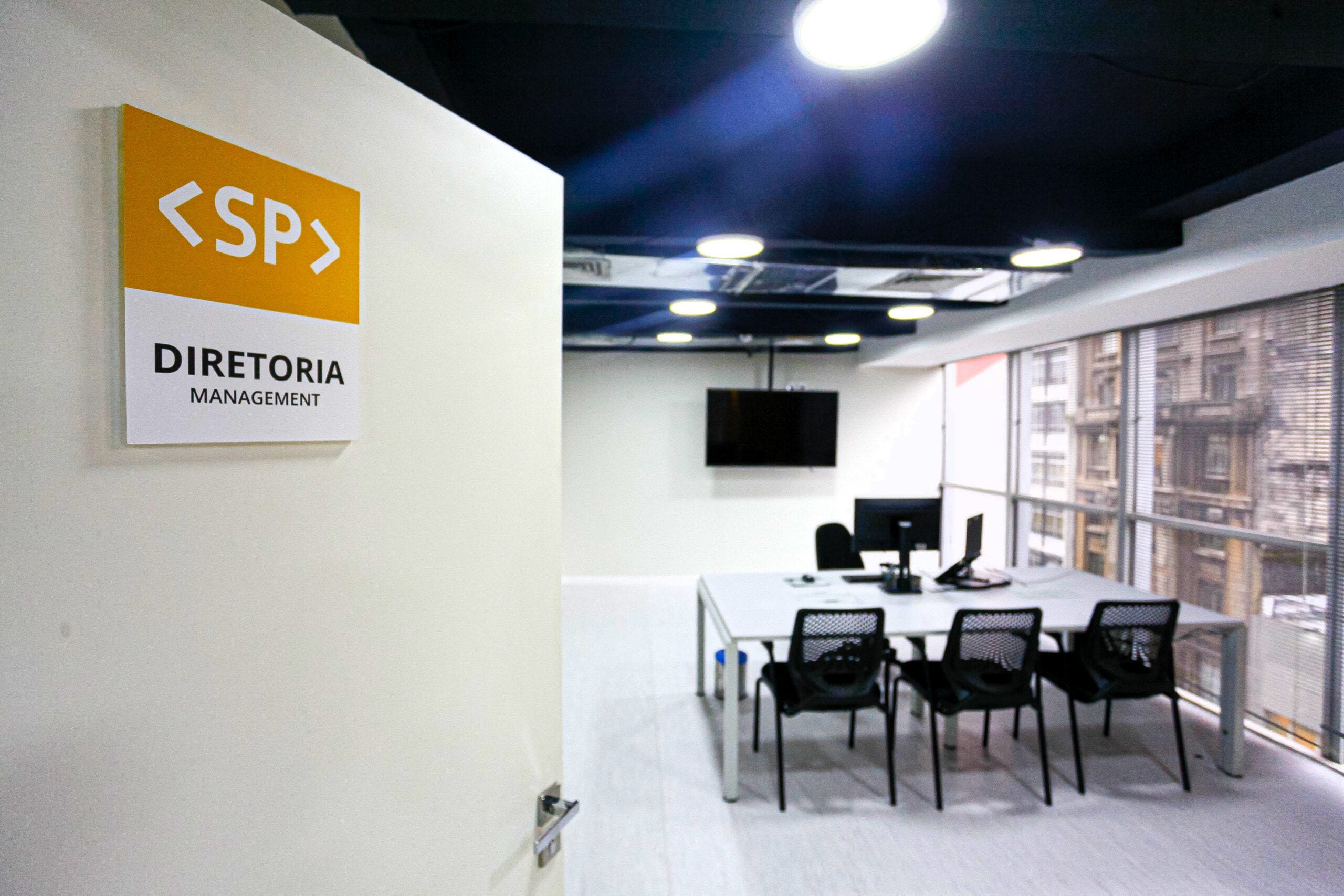 <SP>, criando um sistema de sinalização codificado por cores, garantindo navegação intuitiva num ambiente de tráfego intenso.Design de Interiores e Touchpoints: Direção de arte na aplicação da marca nos espaços físicos. Destaque para o letreiro principal em acrílico transparente sobreposto, a personalização da mesa de recepção com os brasões institucionais e a cenografia do Estúdio de Podcast/Videocast, garantindo que o espaço funcione perfeitamente como cenário para a criação de conteúdo audiovisual e Relações Públicas.