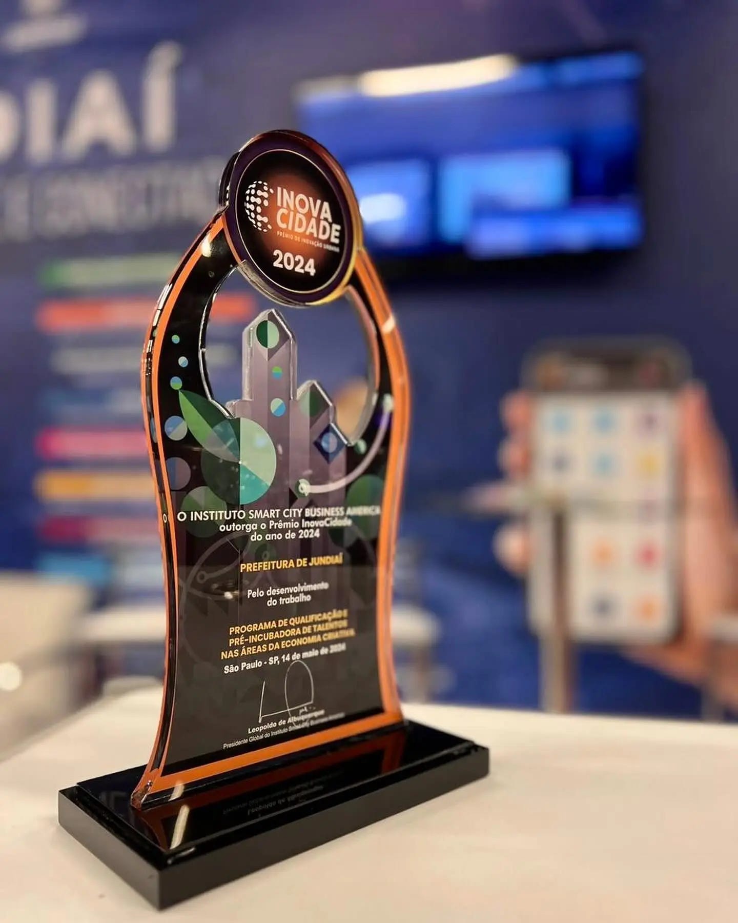 Materialização (O Troféu): A identidade saltou do digital para o físico. Dirigimos o design do troféu em acrílico, combinando recortes estruturais que evocam a silhueta de uma metrópole inteligente (edifícios, folhas simbolizando sustentabilidade e nós de conexão). O prêmio tornou-se um objeto de desejo para os gestores públicos.